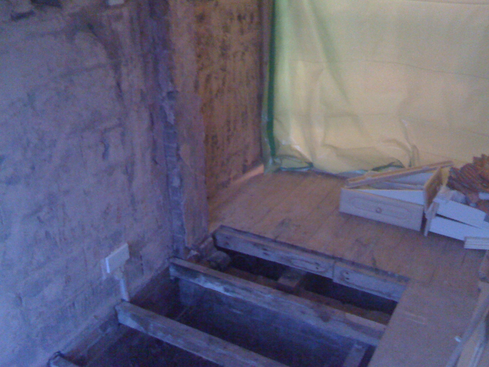The wall is down to blocks, there are floorboards missing – not ideal!