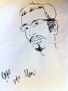 Indeed, he even took time out to rattle off a quick caricature of me whilst we were waiting. Unfortunately Rolf’s kindness to his patient fans meant we didn’t get to hang around and see him again – Rich and I hotfooted it to the game, and I left my spare Didge in Sarah’s custody as a chap filming the various events had proven quite a proficient player – so they could still try to lure the Antipodean legend. I hope they succeeded.