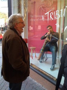 The timing is difficult to determine, but at one point I looked up and saw none other than Rolf Harris standing grinning at the window, visibly moved at the tribute to honour his appearance at the Whitehall Gallery further up the arcade. After a moment of watching and taking in the performance, he got into the window area with us to offer tips on circular breathing (he noted my inability to do it from outside..), and showed he could indeed do it..