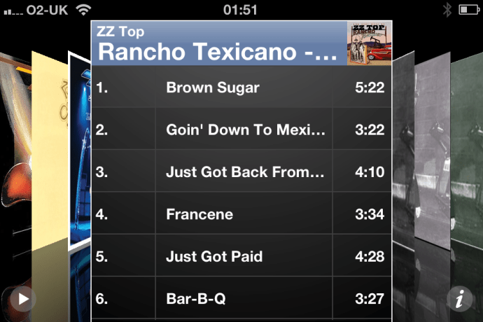 So, even though I know that of the tracks on the screen, only ‘Goin’ Down to Mexico’ is actually present on my iPhone, they’re all presented as available. Should I tap on ‘Brown Sugar’ though, it will download and play as soon as there’s enough data to play with. Which is fine if I want it to do that – if I didn’t, due to data allowances or similar, there’s no indication at all that it needs to go to iCloud to get that track for me.