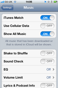 So that’s one very sensible reservation answered – I won’t end up with a big data fee now by accidentally trying to download my entire Levellers collection (yes, that’s predictably what happened!! – shuffle artist with everything showing – oh, I’ll just download ALL that for you, shall I?). As far as I can tell there’s still no option to download iTunes matched content at a 128kbps rate as you can with an iTunes sync – so I imagine I’ll still be switching between Match and non-Match on my phone.