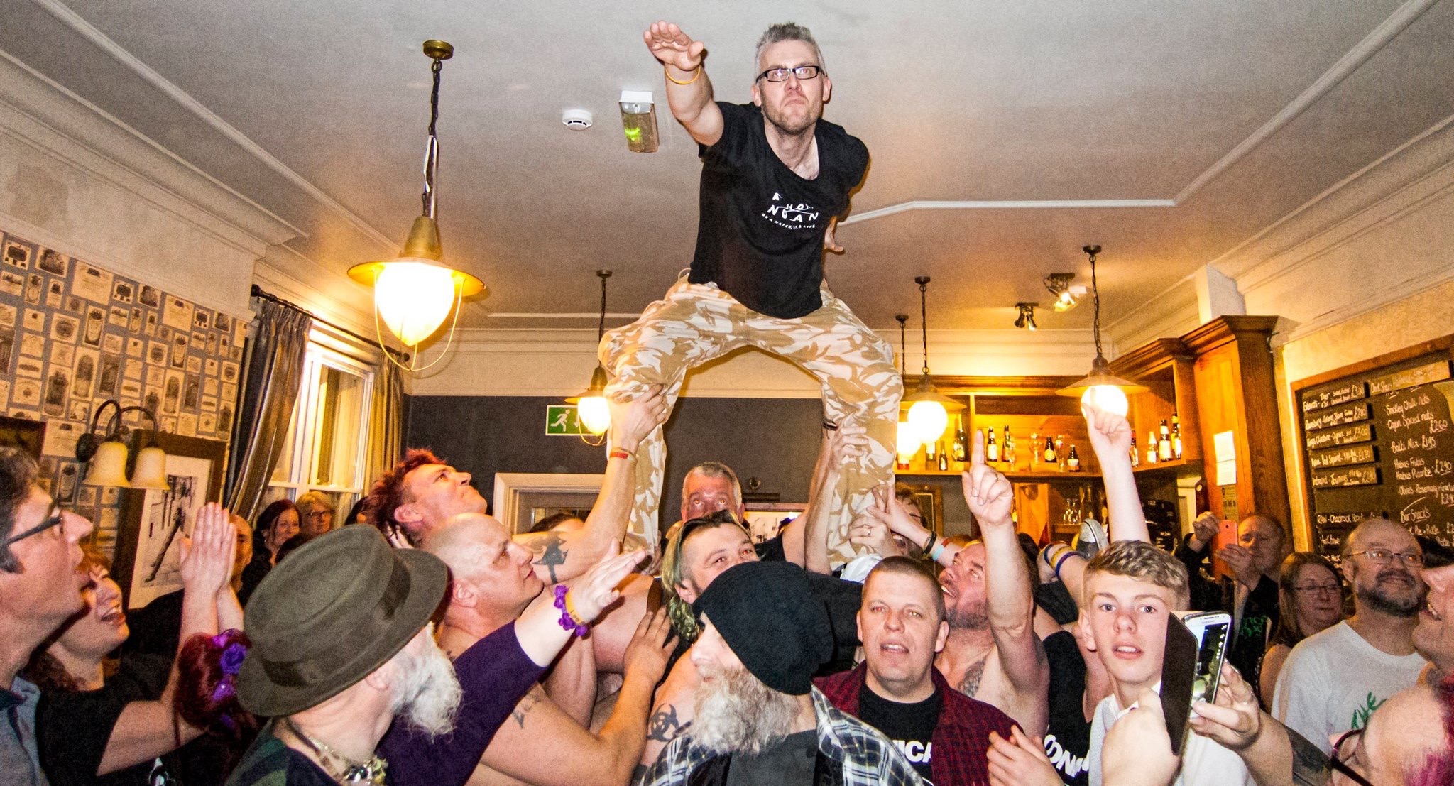 Ferocious Dog draw quite the crowd these days so whilst perhaps the time of arrival a few of us chose might’ve been overly cautious (ha!) – it made for a lovely afternoon of chatting nonsense with people I’d never have known if it weren’t for the band, followed by a standing room only gig at which Dean was adamant we were going to do a role reversal – so I was to graduate from surfboard to surfer. It was a daunting prospect in a packed pub with furniture and glassware not to mention people, but it was pretty clear that refusing wasn’t an option – plus, let’s face it, what an awesome thing to get a chance to do!